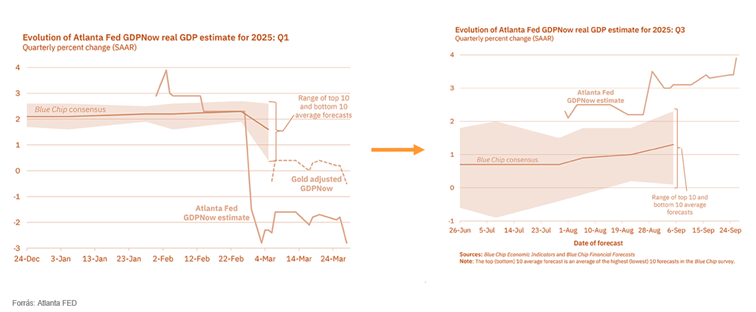 Az Atlanta Fed GDPNow modellje alapján az első negyedévben a reál GDP-növekedési várakozások hirtelen visszaestek, több előrejelzés már enyhe zsugorodást valószínűsített. A „Blue Chip” konszenzus és az előrejelzési sáv is lefelé korrigált, ami a gazdasági lendület megtorpanását jelezte. Ugyanakkor a harmadik negyedévre vonatkozó friss becslések már határozott javulást mutatnak. A növekedési várakozások ismét pozitív tartományba kerültek, és az Atlanta Fed modellje a konszenzust is meghaladó ütemű bővülést jelez. Mindez arra utal, hogy az amerikai gazdaság rövid távon képes volt korrigálni az év eleji gyengülést, és a kilátások inkább a stabilizáció irányába mutatnak.