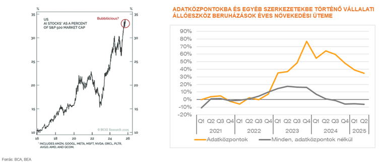 Az Egyesült Államok gazdasága 2025-ben továbbra is ellenállónak bizonyul, a növekedés üteme ugyan mérséklődik, de még nem mutatja recesszió jeleit. A legtöbb előrejelzés szerint 2026-ban jöhet el az a pont, amikor a korábbi kamatemelések és a költségvetési hiány hatása érezhetőbben fékezheti a gazdaságot. Eközben a befektetői figyelem középpontjában marad az AI szektor, amely az utóbbi két évben hajtotta a részvénypiaci emelkedést. Bár az AI körüli optimizmus jelenleg fundamentálisan is alátámasztott, egyre több elemző figyelmeztet a feszített értékeltségre, ami klasszikus buborékképződési jegyeket mutat.
